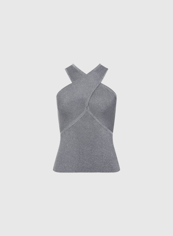A Regata é confeccionada em tricot com fios de lurex, possui caimento ajustado ao corpo, decote transpassado e acabamento canelado.
