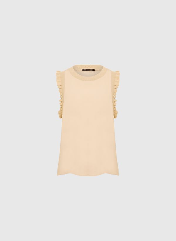A Regata é confeccionada em tecido fluido, possui caimento reto, gola redonda canelada, alças largas com mini babados aplicados, barra arredondada, detalhe de gorgurão na lateral e acabamento pespontado.