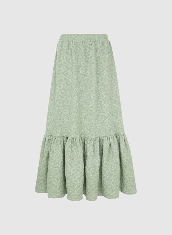 A Saia é confeccionada em tecido plano com Jacquard Brixto e estampa em relevo, possui modelagem evasê, comprimento midi, babados e acabamento pespontado.