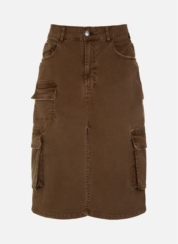 Confeccionada em sarja, a Saia possui modelagem cargo, cós com passantes, bolsos frontais, laterais e posteriores, fechamento frontal por zíper e botão, etiqueta externa aplicada e acabamento pespontado.