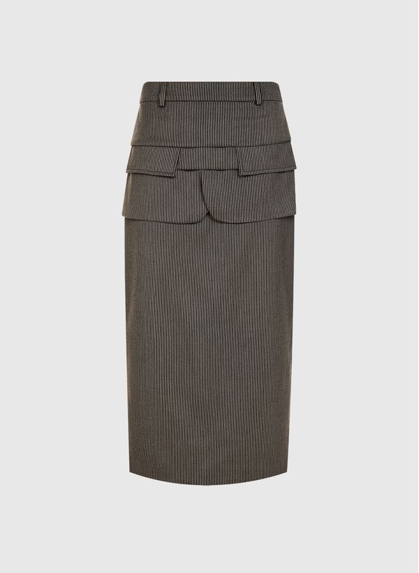 A Saia é confeccionada em tecido plano com padronagem listrada, possui modelagem alfaiataria, cós com passantes, detalhes sobrepostos, fechamento posterior por zíper, fenda posterior, forro embutido, comprimento midi e acabamento pespontado.