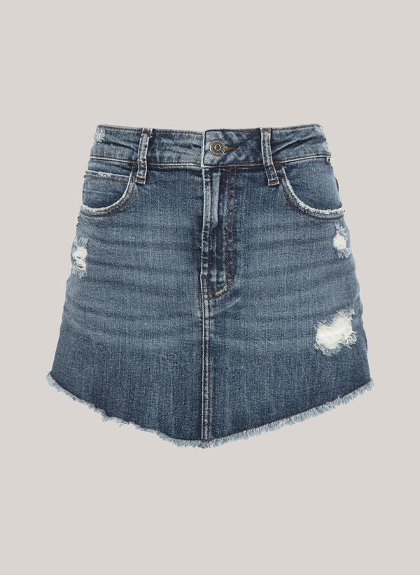 detalhes em rasgos e puídos, fechamento frontal por zíper e botão, comprimento curto, etiqueta externa aplicada, barra cortada a fio e acabamento pespontado.