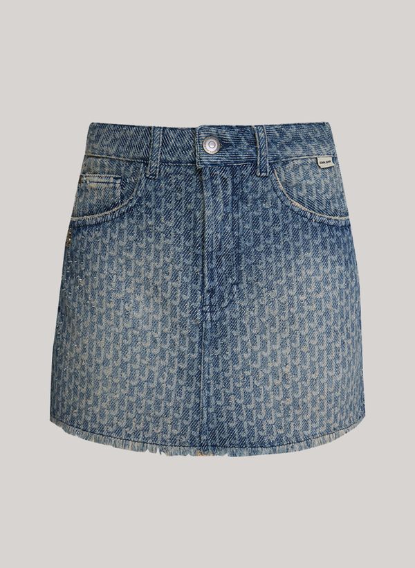 Confeccionada em sarja, a Saia possui modelagem evasê, cós com passantes, cinco bolsos, estampa institucional aplicada por toda a peça, fechamento frontal por zíper e botão, comprimento curto, barra cortada a fio e acabamento pespontado.