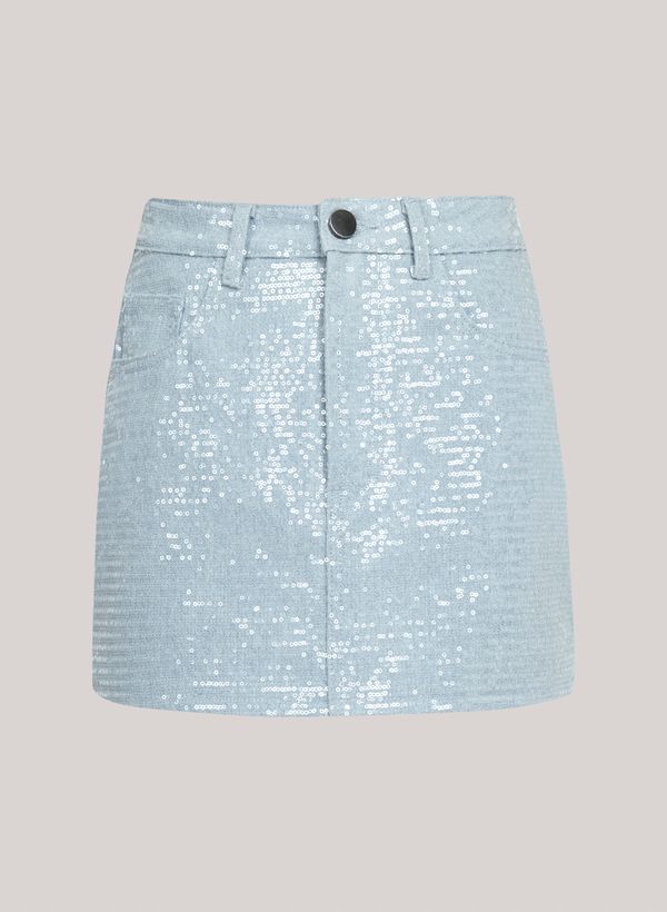 Confeccionada em jeans com aplicações de paetês, a Saia possui modelagem evasê, cós com passantes, bolsos frontais e posteriores, fechamento frontal por zíper e botão, etiqueta externa aplicada, comprimento curto e acabamento pespontado.
