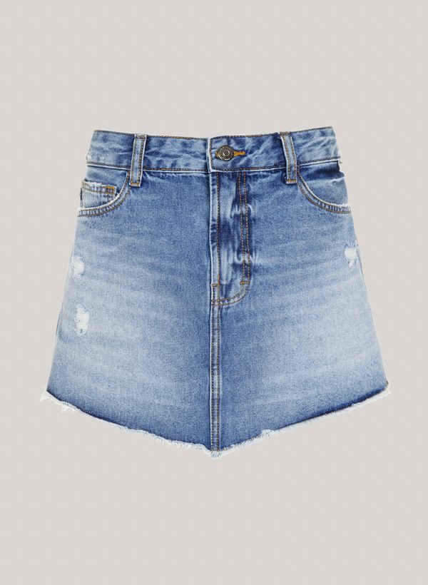 Confeccionada em jeans com lavagem destroyed, a Saia possui modelagem reta, cós com passantes, bolsos frontais e posteriores, detalhe em puídos, fechamento frontal por zíper e botão, etiqueta externa aplicada, comprimento curto, barra assimétrica cortada a fio e acabamento pespontado.