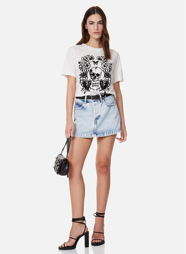 Confeccionada em jeans, a Saia possui modelagem mais ajustada ao corpo, corte reto, comprimento curto, sem rasgos, detalhe de leves rebolos nos bolsos e barra, costura em linha ocre, vista grande e deslocada e fechamento frontal por zíper e botão.