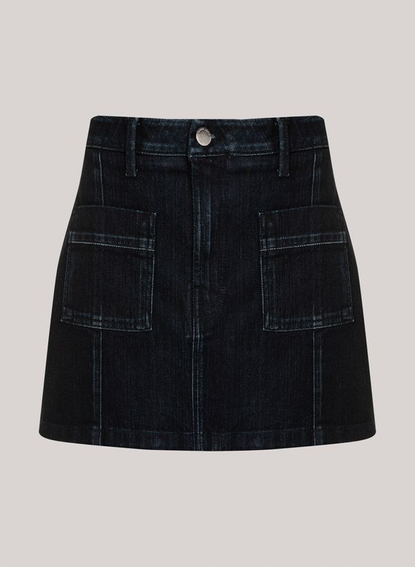 Confeccionada em jeans com lavagem estonada, a Saia possui modelagem reta, cós com passantes, bolsos frontais, fechamento frontal por zíper e botão, comprimento mini, etiqueta externa aplicada e acabamento pespontado.
