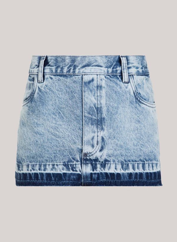 Confeccionada em jeans, a Saia possui modelagem reta, comprimento curto, cós com passantes, fechamento posterior por zíper, barra dupla e acabamento pespontado.
