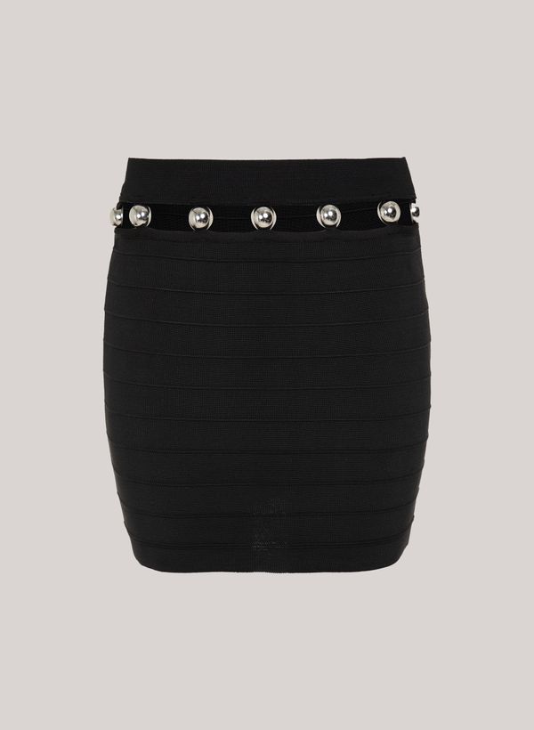 Confeccionada em tricot, a Saia possui modelagem justa, cós com recorte frontal e apliques metalizados, comprimento curto, plaquinha metalizada personalizada aplicada e acabamento canelado.