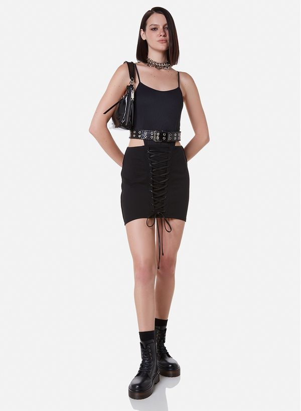 Confeccionada em malha creponada, a saia possui modelagem justa, comprimento curto, cintura frontal arredondada, detalhe de cordão de couro cruzado na frente e fechamento por zíper de metal na parte posterior.