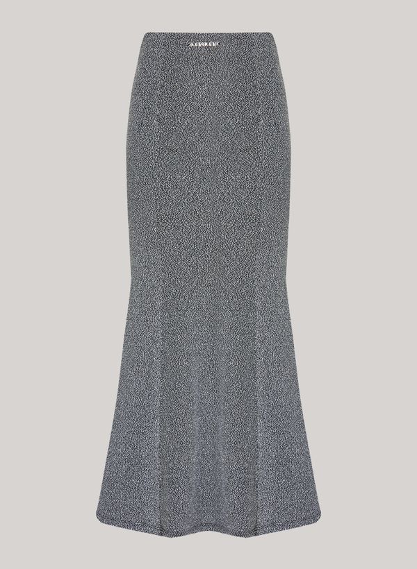 Confeccionada em malha black com brilho, a Saia possui modelagem justa, comprimento longo, shape sereia, fenda centro costas valorizando a silhueta feminina e acabamento pespontado.