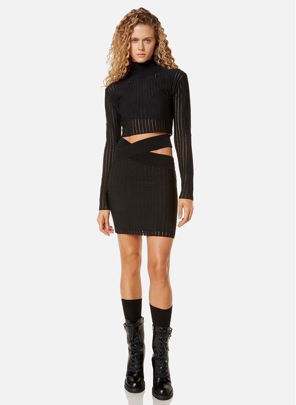 Confeccionada em tricot canelado, a Saia possui modelagem justa ao corpo, cós de bandagem transpassado. A peça possui transparência.