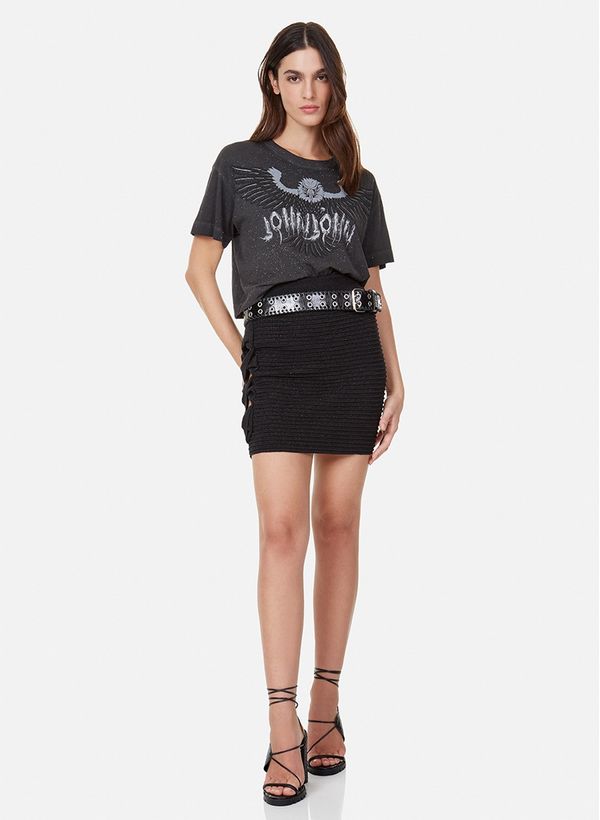 Confeccionada em tricot com lurex, a Saia possui modelagem mais ajustada ao corpo, comprimento curto e detalhe de recorte lateral com torção.