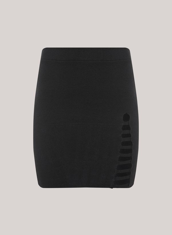 Confeccionada em tricot, a Saia possui modelagem justa, cintura intermediária, fenda lateral com recortes, comprimento curto e acabamento canelado.