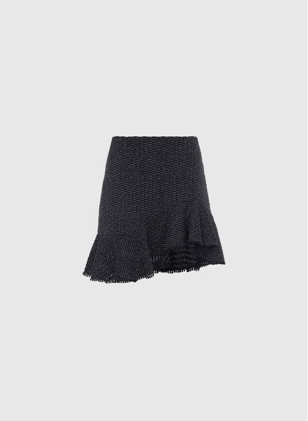 A Saia é confeccionada em malha com fios de lurex, possui pala ajustada, recorte com babados assimétricos, fechamento posterior por zíper e comprimento curto.
