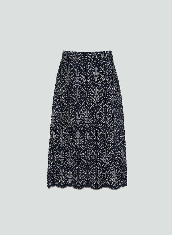 Confeccionada em tecido plano, a saia possui modelagem evasê, bordados, fechamento por zíper invisível, barra ondulada, comprimento midi e acabamento pespontado.
