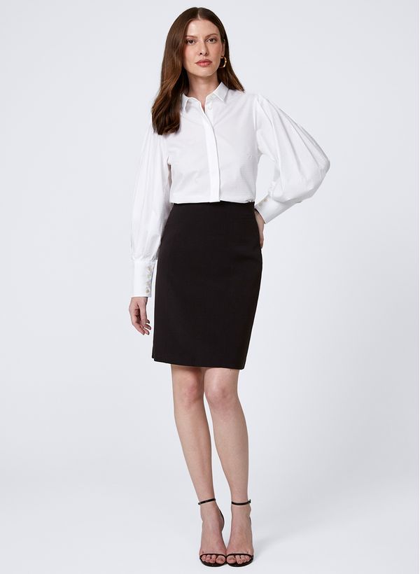 A saia é confeccionada em tecido plano, possui modelo lápis em alfaiataria, cintura alta, recortes laterais, fechamento por zíper e acabamento pespontado.