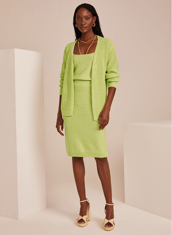 A Saia é confeccionada em tricot, possui modelagem lápis, cós aplicado, comprimento médio e acabamento canelado.
