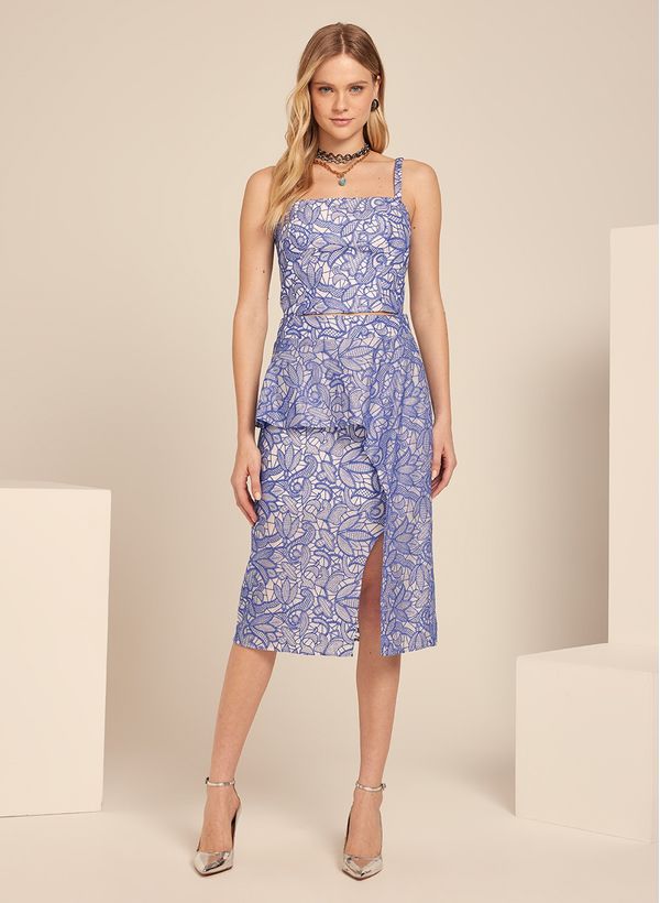 A Saia é confeccionada em tecido plano com renda em alto relevo, possui modelagem evasê, cós aplicado, detalhe de babados, fechamento lateral por zíper, comprimento midi, fenda frontal e acabamento pespontado.