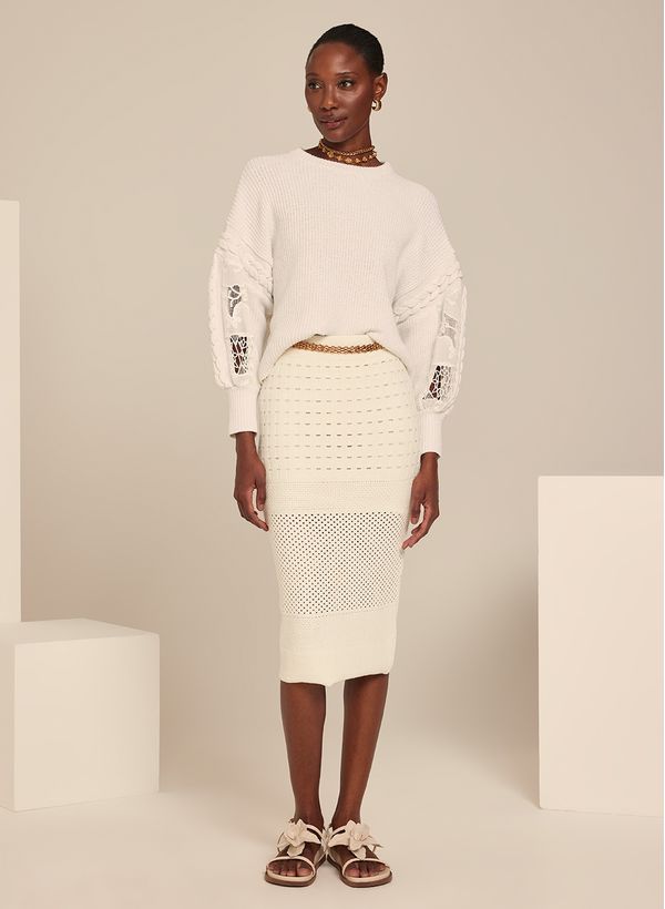 A Saia é confeccionada em tricot, possui transparência através dos mini vazados, caimento justo, cós aplicado, forro embutido, comprimento midi e acabamento canelado.