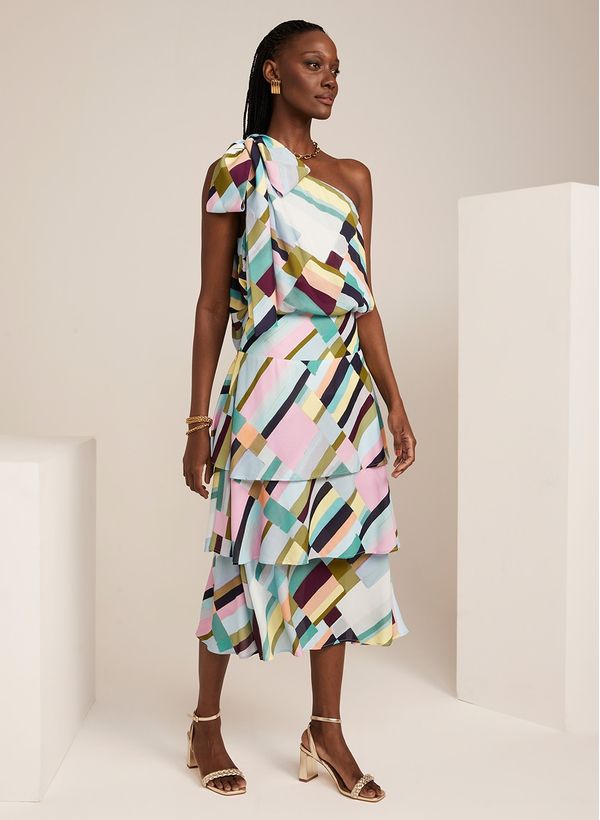 A Saia é confeccionada tecido fluido com estampa, possui modelagem evasê, babados aplicados, lastex aplicado na parte posterior, fechamento lateral por zíper invisível, comprimento midi e acabamento pespontado.