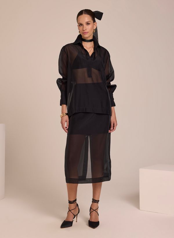 A Saia é confeccionada em organza, possui transparência, fechamento posterior por zíper, forro curto embutido, fenda posterior, comprimento midi e acabamento pespontado.