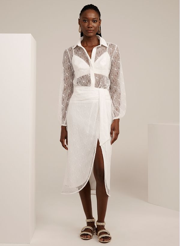 Garantindo um ar chic e o charme infalível das peças de renda, a Saia Brooke é perfeita para montar um look sofisticado. Use com acessórios dourados, top, camisa e sandália rasteira, para um visual all white poderoso.