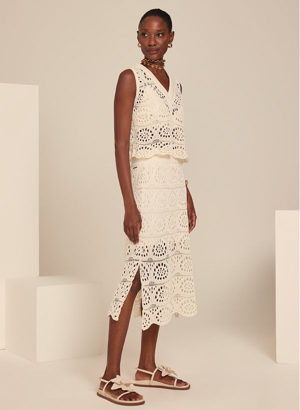 A Saia é confeccionada em tricot, possui mini vazados, modelagem reta, cós aplicado, forro embutido, fenda na lateral, barra ondulada, comprimento midi e acabamento canelado.