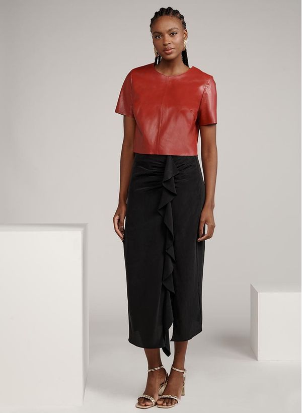 A Saia é confeccionada em seda, possui modelagem reta, detalhe de babados na lateral com franzidos, fechamento na lateral por zíper, fenda frontal, comprimento midi, forro embutido e acabamento pespontado.