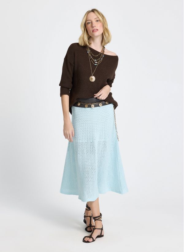 A Saia é confeccionada em tricot, possui modelagem evasê, cós aplicado, mini vazados com transparência, forro embutido, comprimento midi e acabamento canelado.