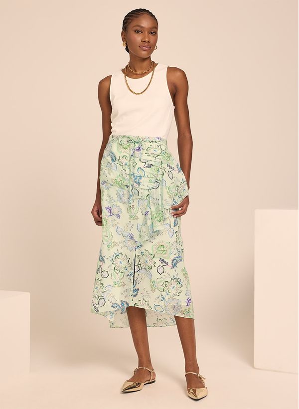 A Saia é confeccionada em tecido plano com toque de linho, possui estampa, modelagem evasê, cós com passantes, cordão para amarração,detalhe drapeado,fechamento posterior por zíper invisível, comprimento midi e acabamento pespontado.