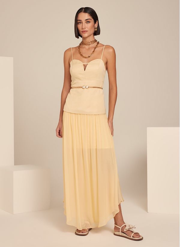 A Saia é confeccionada em tecido fluido, possui modelagem evasê, cós largo com detalhe de franzidos, fechamento lateral por zíper invisível, fendas nas laterais, forro embutido, comprimento midi e acabamento pespontado.