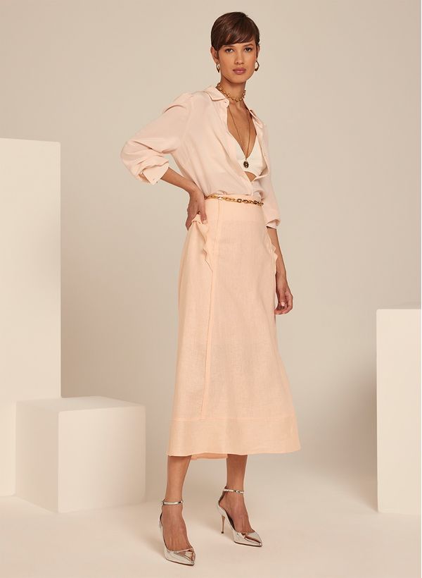 A Saia é confeccionada em linho, possui modelagem evasê, detalhe de babados sobrepostos, fechamento lateral por zíper invisível, comprimento midi e acabamento pespontado.