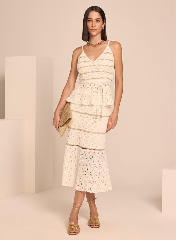 A Saia é confeccionada em tricot, possui detalhes mini vazados, comprimento midi e acabamento canelado.