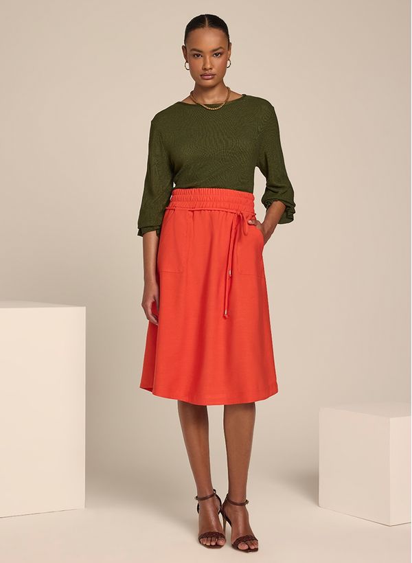 A Saia é confeccionada em tecido plano, possui modelagem evasê, cós aplicado com lastex e cordão para amarração, dois bolsos frontais, comprimento midi e acabamento pespontado.