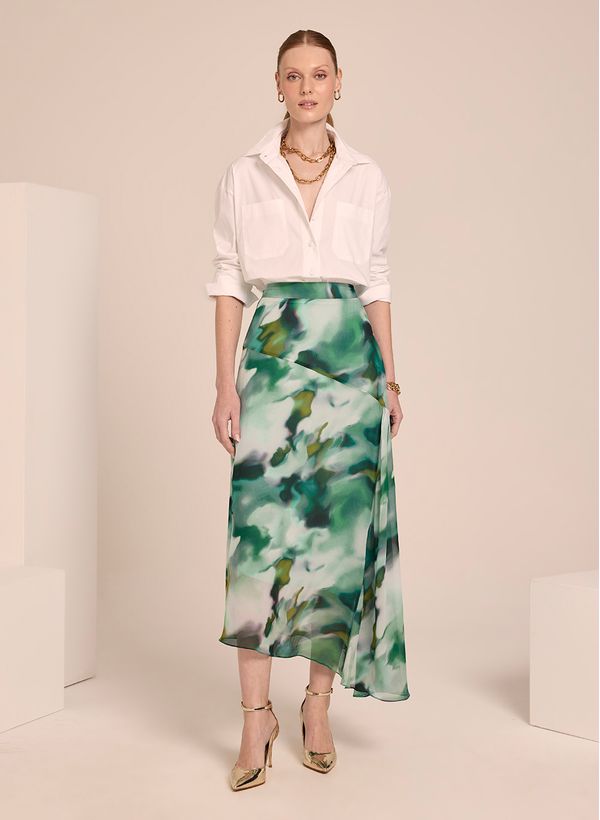 A Saia é confeccionada em tecido fluido, possui estampa boreal, modelagem levemente evasê, recorte assimétrico com detalhe aplicado na lateral, forro embutido, comprimento midi, barra assimétrica com transparência e acabamento pespontado.