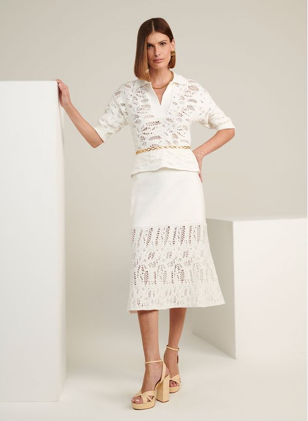 A Saia é confeccionada em tricot, possui leve transparência na barra, comprimento midi e acabamento canelado.