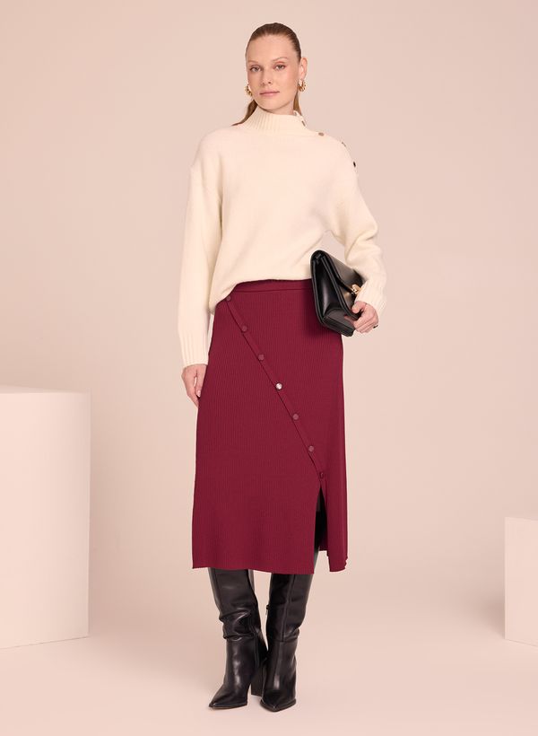 A Saia é confeccionada em tricot, possui modelagem mais ampla ao corpo, corte transversal com fenda e botões para fechamento.