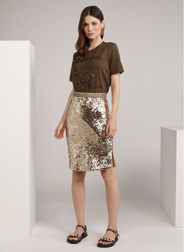 As peças em paetês são perfeitas para valorizar e elevar o visual sem muito esforço. Combine a Saia Veronica com camiseta estampada e papetes, o resultado é um look autêntico e moderno.