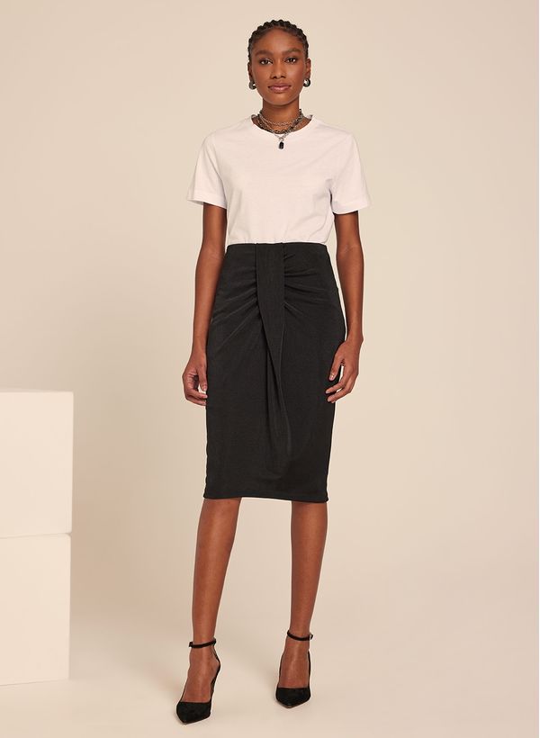 A Saia é confeccionada em malha, possui caimento ajustado, detalhe de pala frontal com drapeado, fechamento frontal por zíper, comprimento médio e acabamento pespontado.