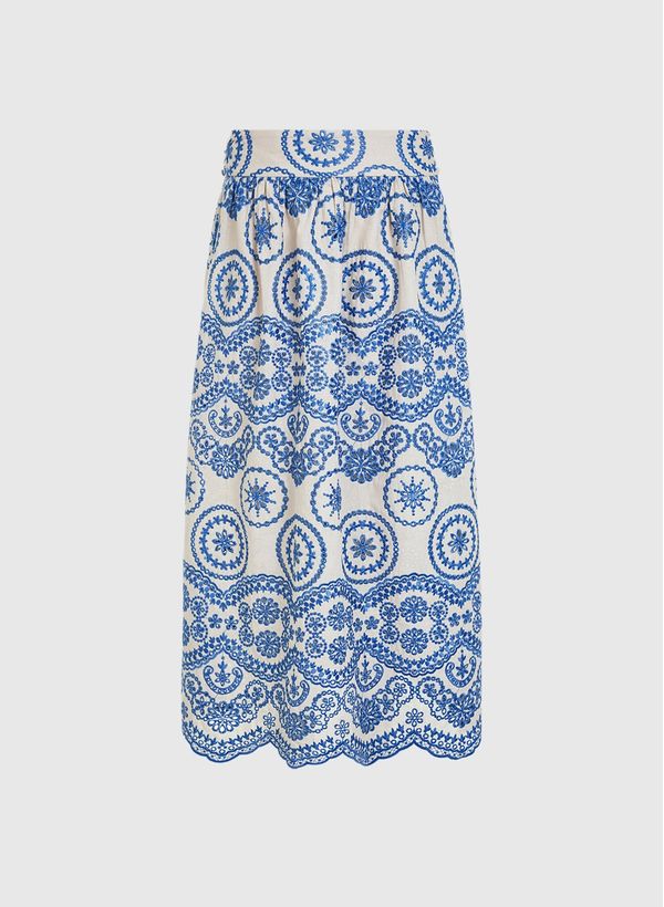 A Saia é confeccionada em tecido plano com toque de linho, possui modelagem evasê, bordados em efeito de entremeios, cós aplicado, cintura alta, fechamento lateral por botões revestidos e zíper invisível, comprimento midi e acabamento pespontado.