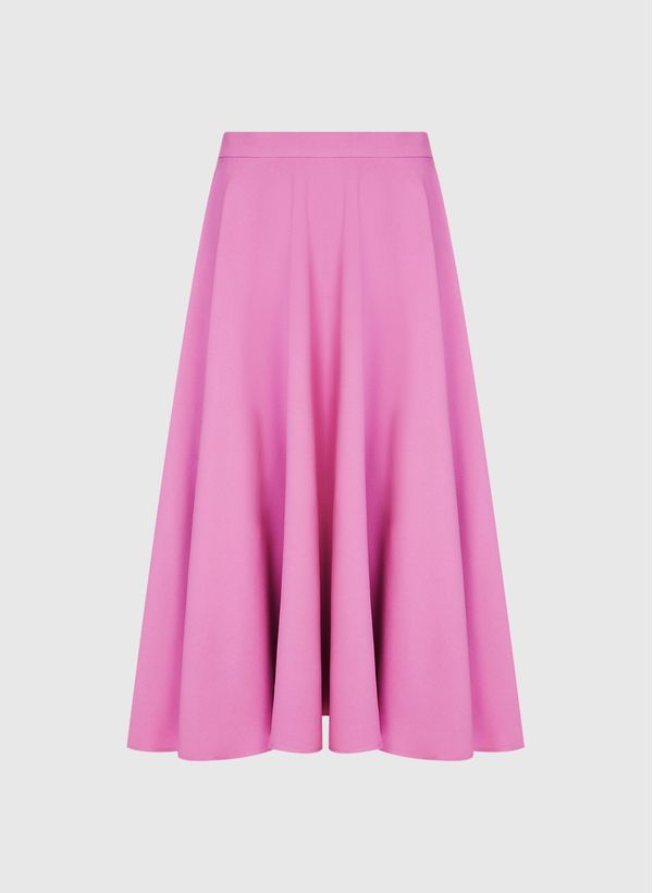 A Saia é confeccionada em tecido plano, possui modelagem evasê, modelo alfaiataria, cintura alta, cós aplicado, fechamento lateral por zíper invisível, comprimento midi e acabamento pespontado.
