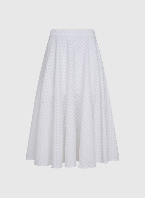 A Saia é confeccionada em tecido plano, possui modelagem evasê, cós aplicado, comprimento midi e acabamento pespontado.