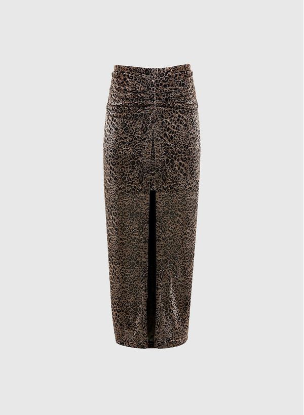 Confeccionada em malha, a Saia possui modelagem reta, detalhe franzido com fenda frontal, comprimento midi, estampa onça e acabamento pespontado.