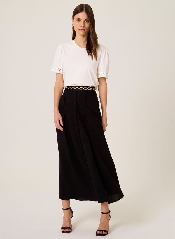 Confeccionada em tecido fluido, a saia possui modelagem Midi, cintura média, vista frontal coberta e detalhes nas laterais.
