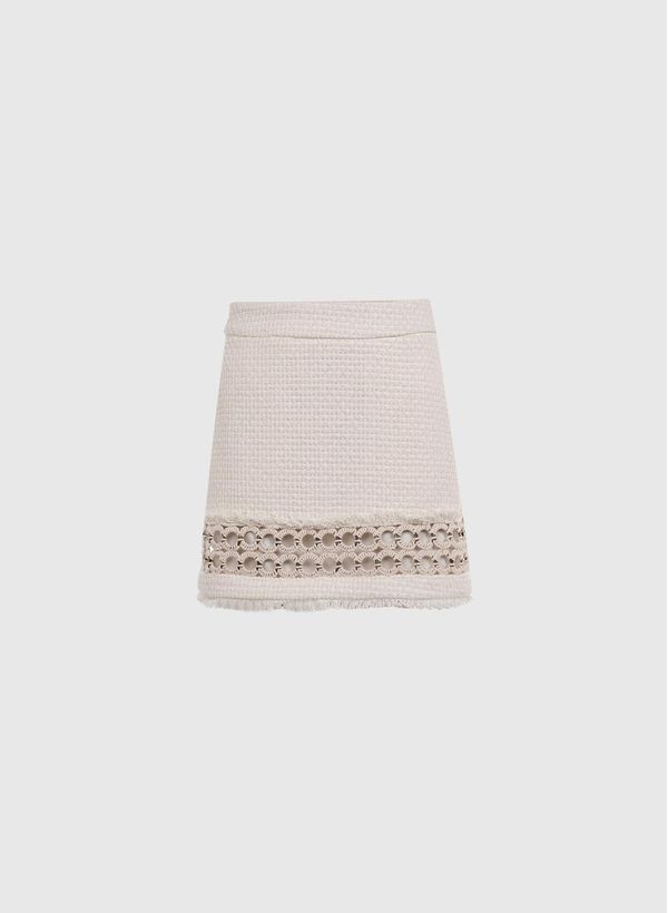 Confeccionado em tweed com modelagem alfaiataria, a Saia possui comprimento curto, aplicação de argola de metal forrada de macramê de barbante, acabamento com franjas, barra com acabamento de franjas do próprio tecido, aplicação posterior de tag metalizada da marca, fechamento posterior por zíper e acabamento pespontado.