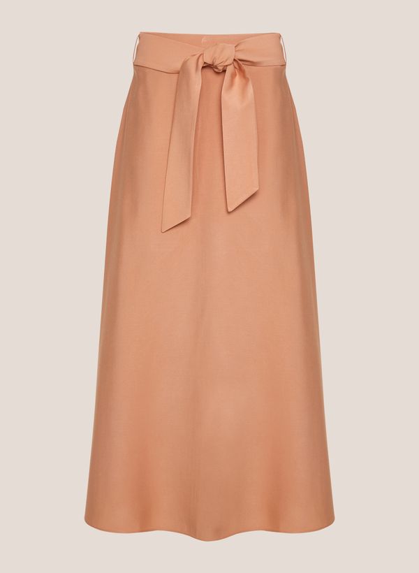 Confeccionada em tecido plano, a Saia possui modelagem levemente evasê, comprimento Midi, cós largo com passantes aplicados, faixa para amarração frontal do mesmo tecido, caimento fluido e acabamento pespontado na barra.