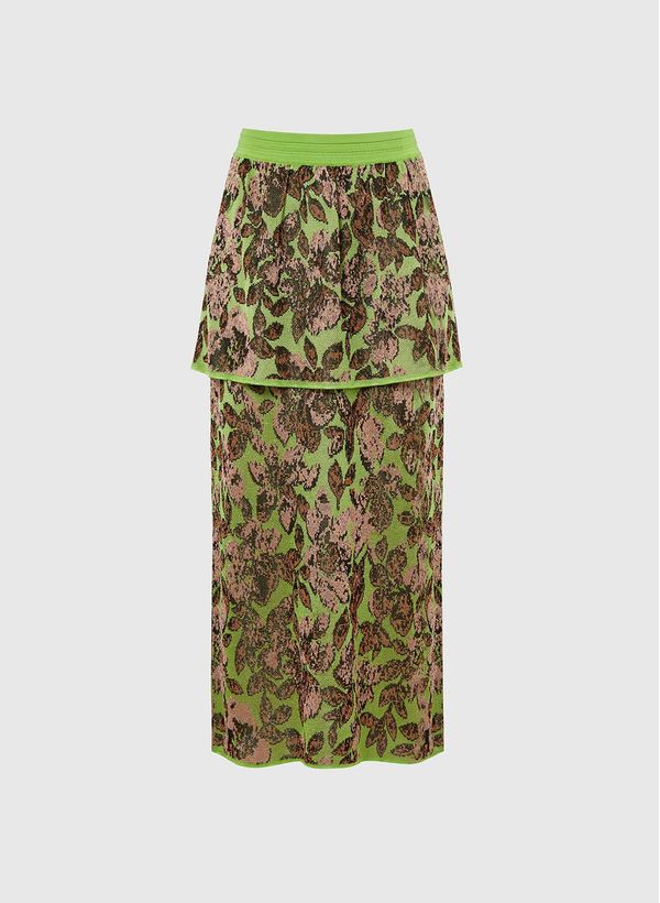 Confeccionada em tricot rayon com fios de lurex, a Saia possui padronagem floral, modelagem levemente evasê, cós canelado, detalhe de pala sobreposta, aplicação posterior exclusiva do logo da marca, comprimento midi e acabamento canelado.