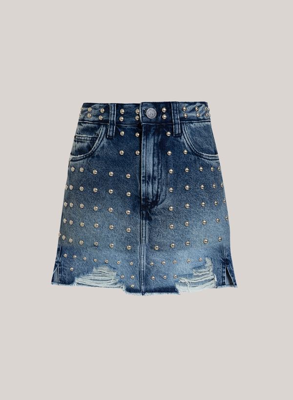 Confeccionada em jeans, a Saia possui modelagem justa, comprimento curto, cinco bolsos, fechamento frontal por zíper e botão, cós com passantes, detalhes em destroyed, aplicação de tachas na sua extensão e acabamento pespontado.