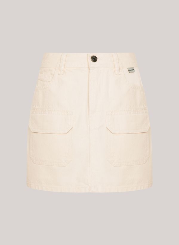 Confeccionada em sarja, a Saia possui modelagem reta, cós com passantes, bolsos tipo cargo, fechamento frontal por zíper e botão, etiqueta externa aplicada, comprimento curto e acabamento pespontado.